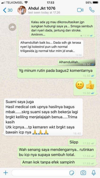 Telah teruji oleh 1004 responden (usia 20-80 tahun) dengan keluhan angina pectoris dan penyakit jantung. Jadilah salah satu dari customer kami dan buktikan khasiat dari Tasly ICP Capsule.